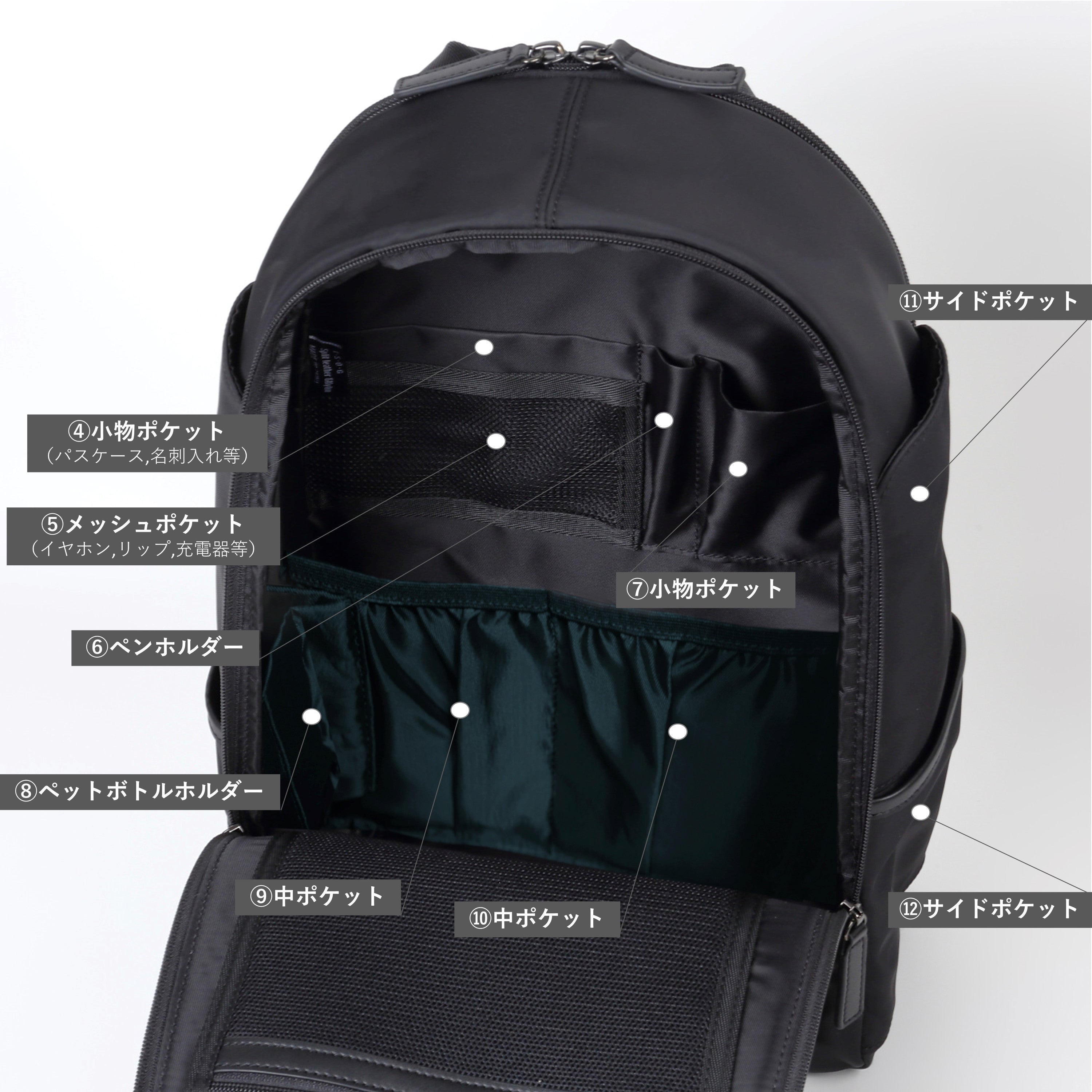 メインコンパートメントは大きく開くので、カバンの中身が可視化され荷物のありかが一目瞭然です。大小様々なポケットを使い分けることで、一層整理整頓が進み忙しい方には嬉しい機動力が増します。