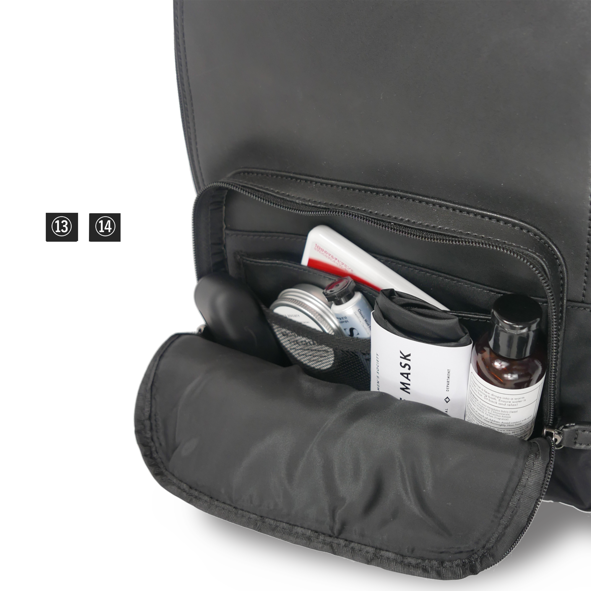 メインコンパートメントの奥側には、大小様々なポケットが用意されており、外側ポケットに収納するのが心配なアイテムを中心に収納できます。