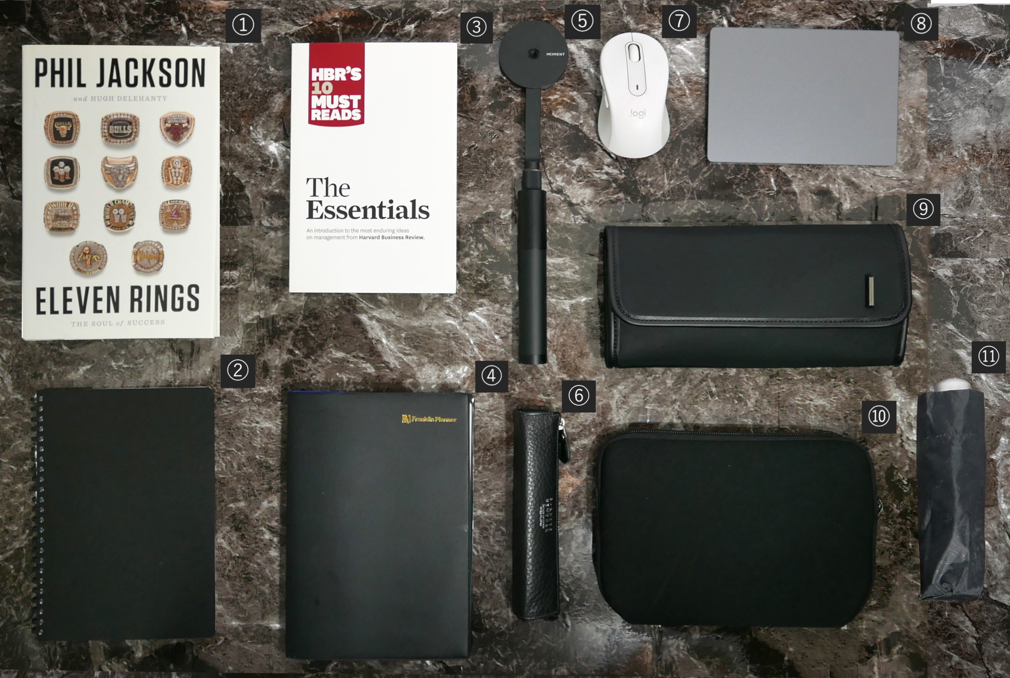 荷物の収納例:①本(大サイズ) ②ノート ③本(中サイズ) ④手帳 ⑤自撮り棒 ⑥ペンケース ⑦マウス ⑧マウス卓上型 ⑨PCポーチ ⑩マルチポーチ ⑪折りたたみ傘