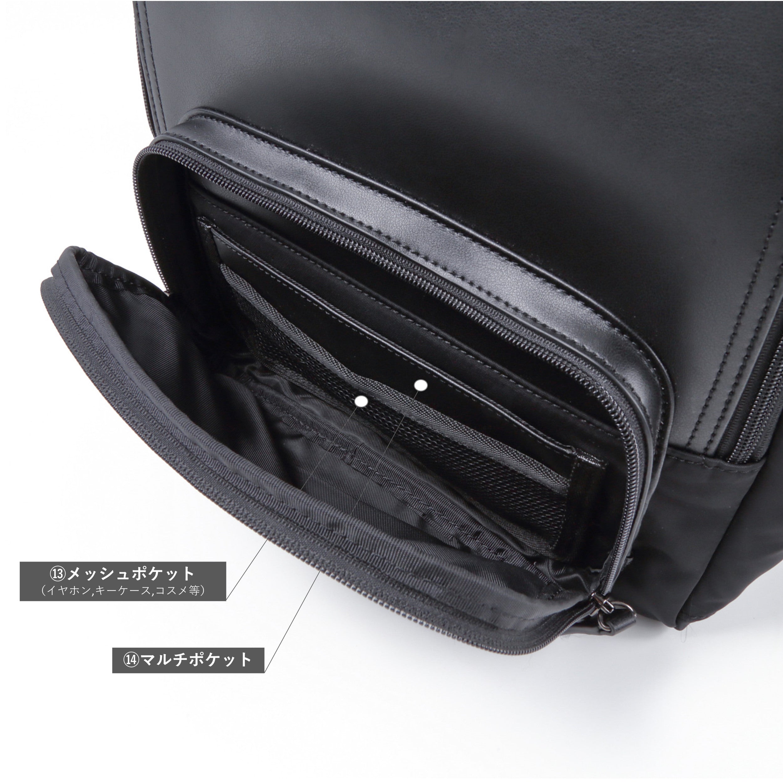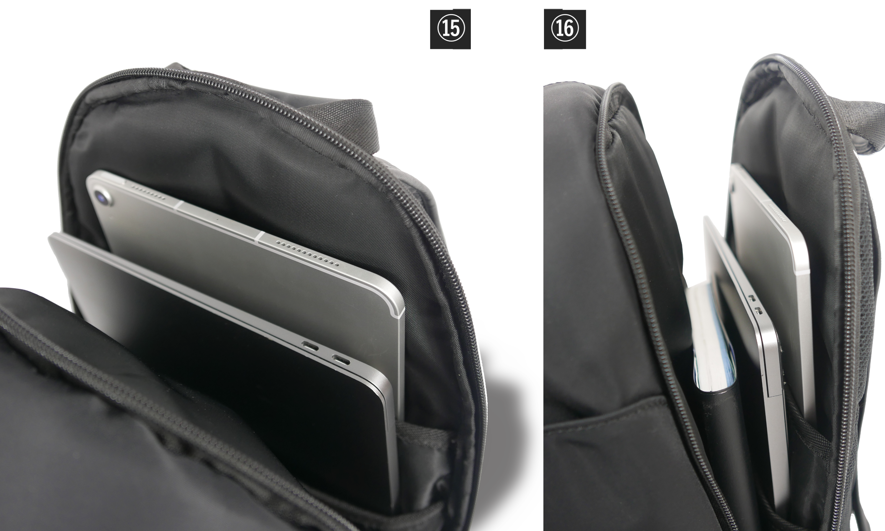 13インチのPCは1段目のPCポケット(⑯)にラクラク収納可能です。(ポケット内寸:横幅23.55cm✕縦幅21.5cm ※縦幅は31cm程度までならストレスなく収納可能です)