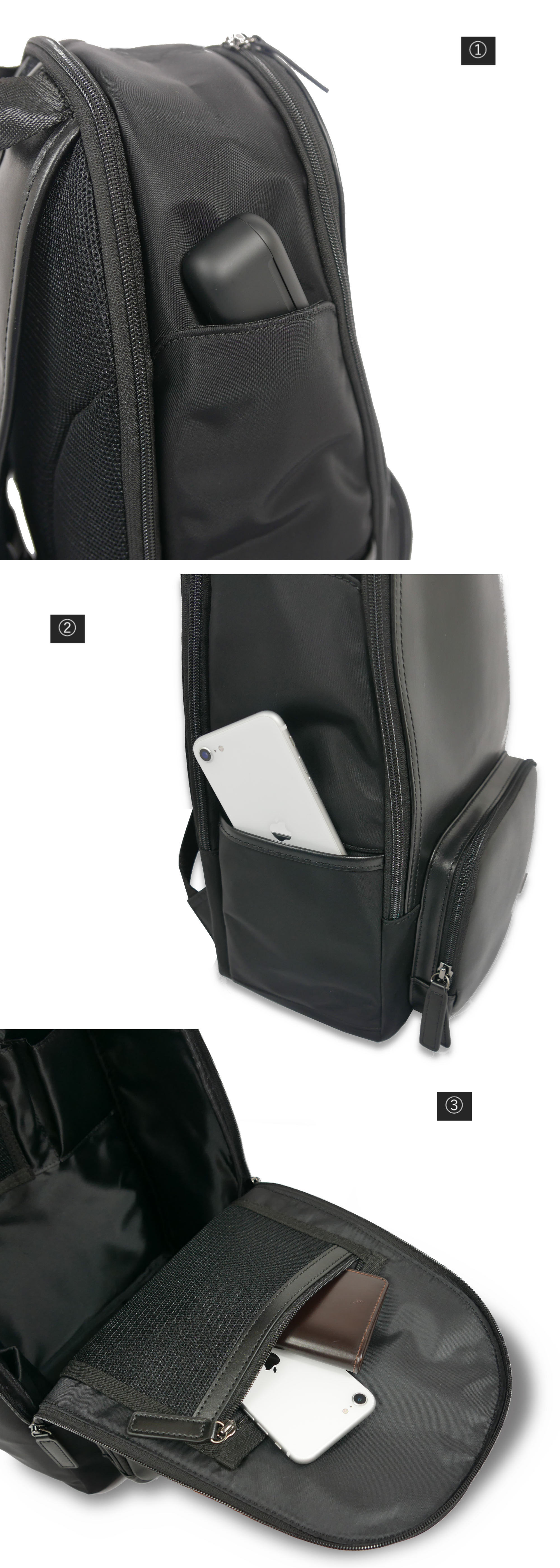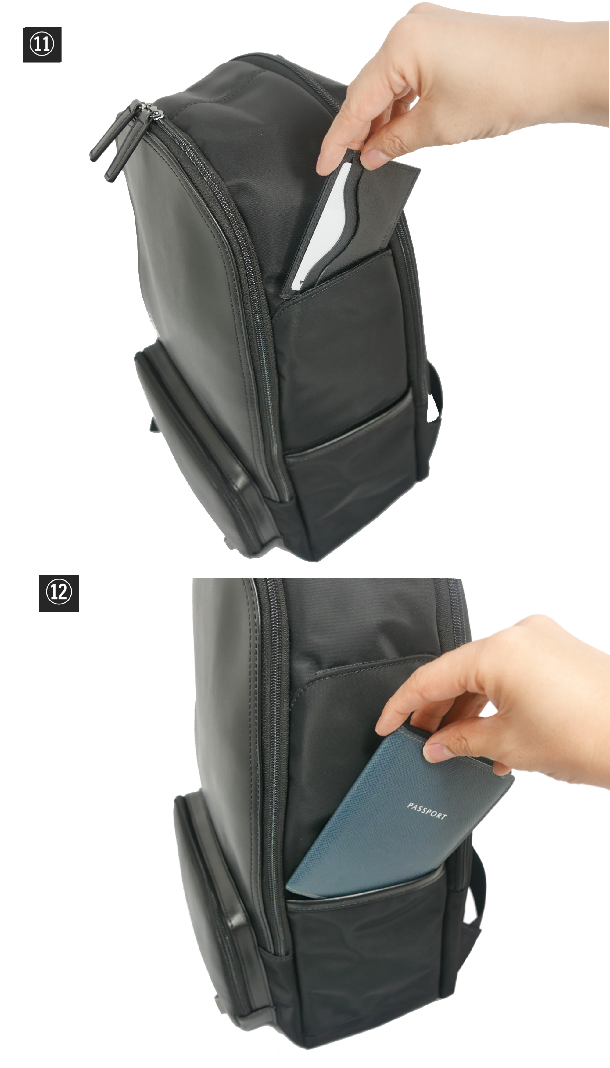 ③はジッパー付きマルチポケットですので、名刺入れ等サイドポケットに収納するのは、心配なアイテムを入れるのに便利です。