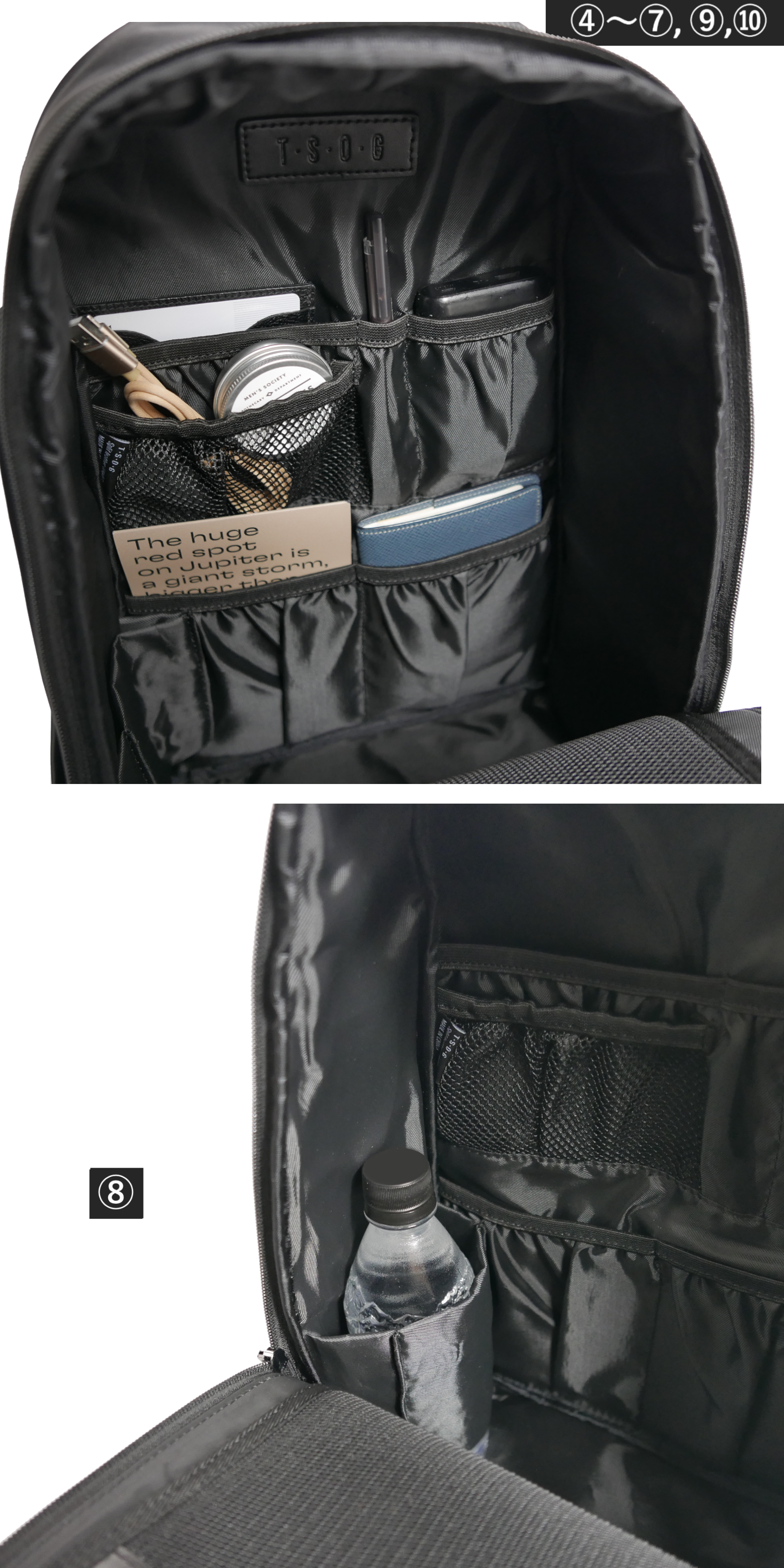 TANはリュックでも珍しいダブルサイドポケットを用意しており、両サイド合わせて計4つ(①、②、⑧、⑩)のポケットをご使用頂けます。