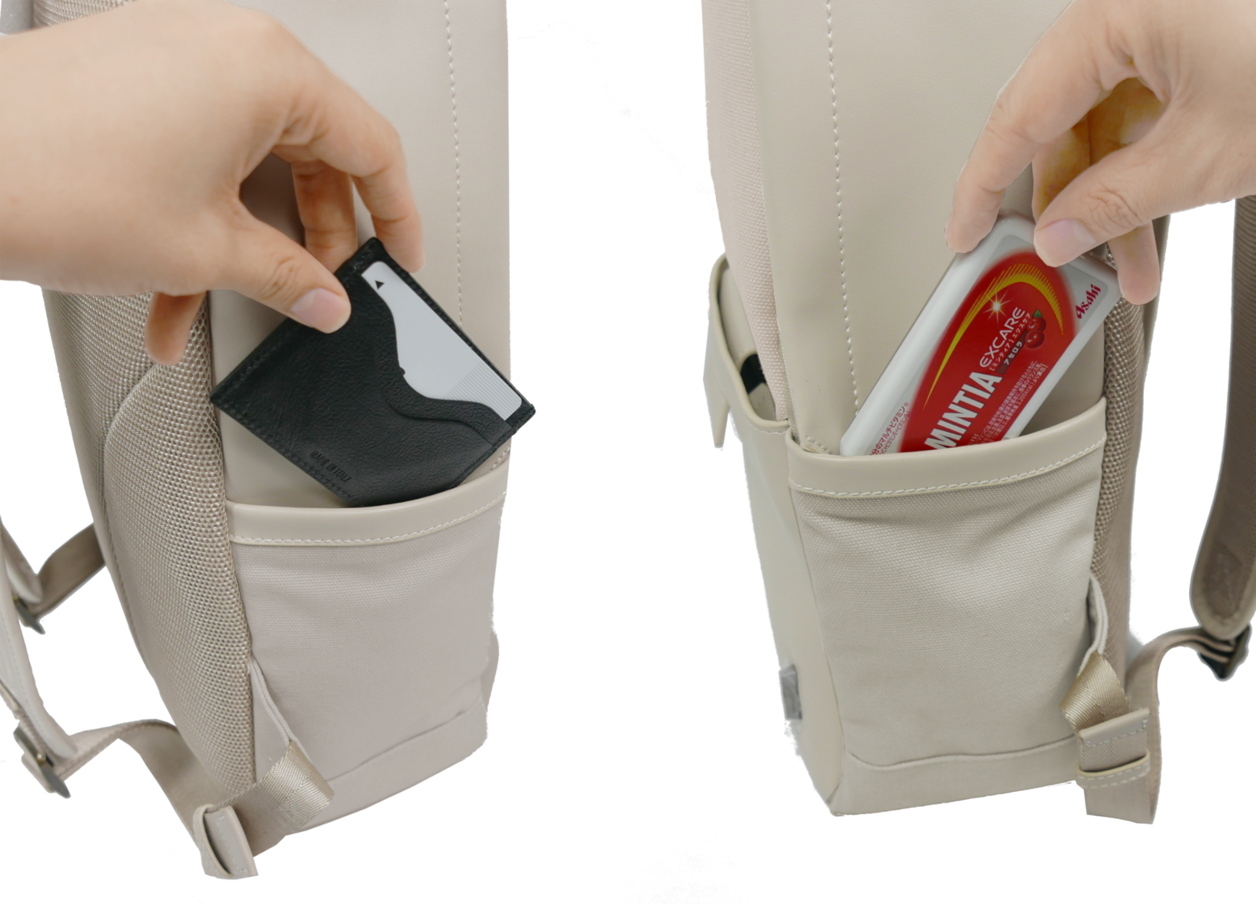 両サイドに配置されたサイドポケットは、アクセス頻度の高い、交通系電子マネー(カード)やMINTIA等の口臭ケアといった小物を収納するのに便利です。