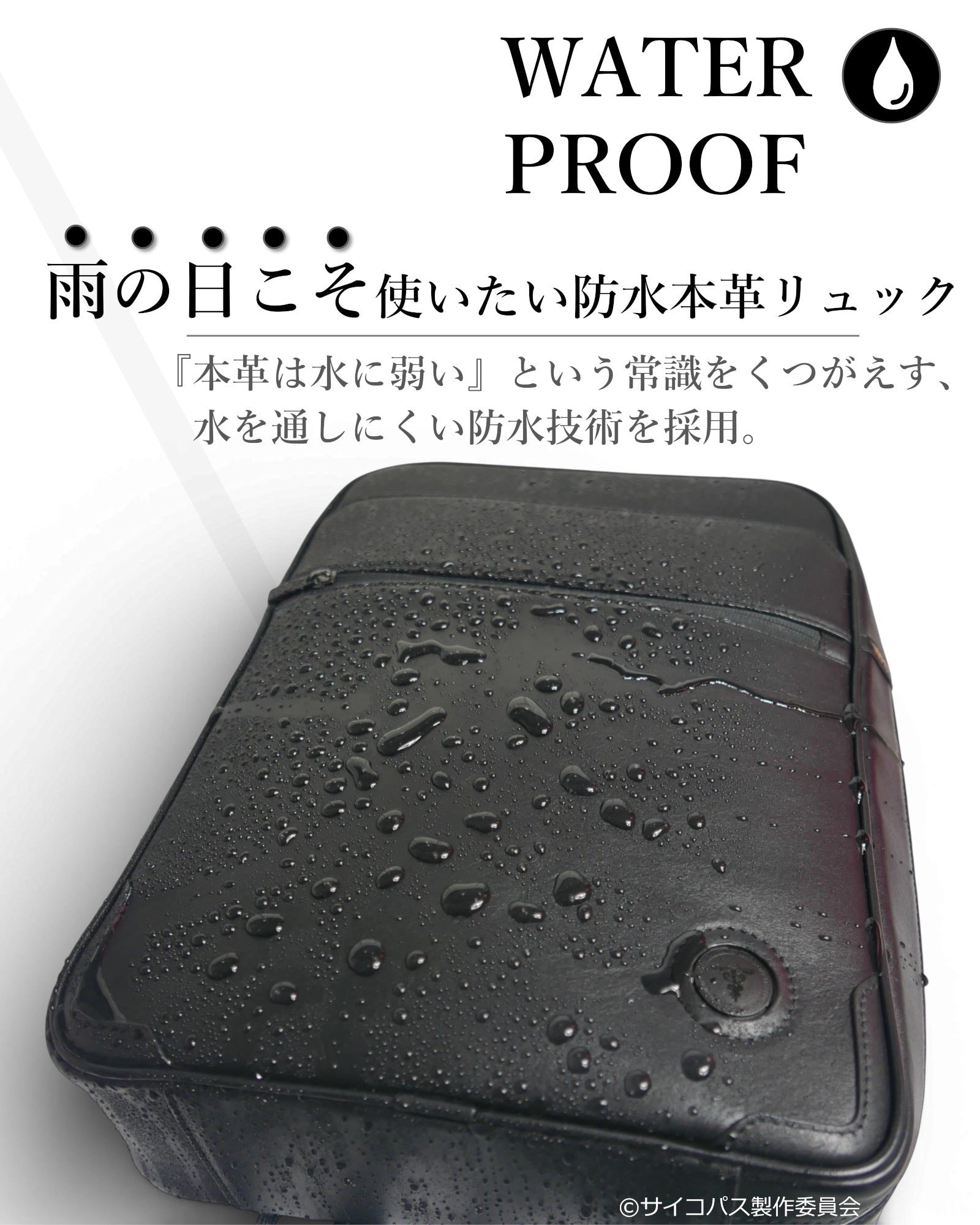 表面に撥水加工ではなく、革をなめす段階から防水性のある溶剤を被下層まで浸透させているため、半永久的に防水性が期待できます。※完全防水ではございませんので、縫い目等の隙間から水が浸入する可能性がございます