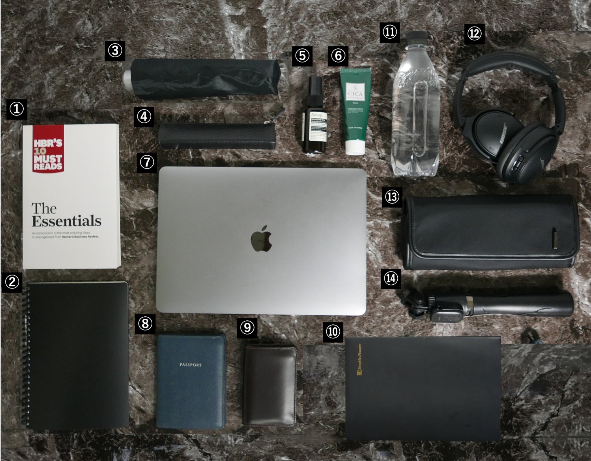 上記荷物の収納例:①本(大サイズ) ②ノート ③折りたたみ傘 ④ペンケース ⑦ノートPC(13インチ) ⑩ノート ⑪ペットボトル ⑫ヘッドフォン ⑬マルチポーチ ⑭折りたたみ三脚