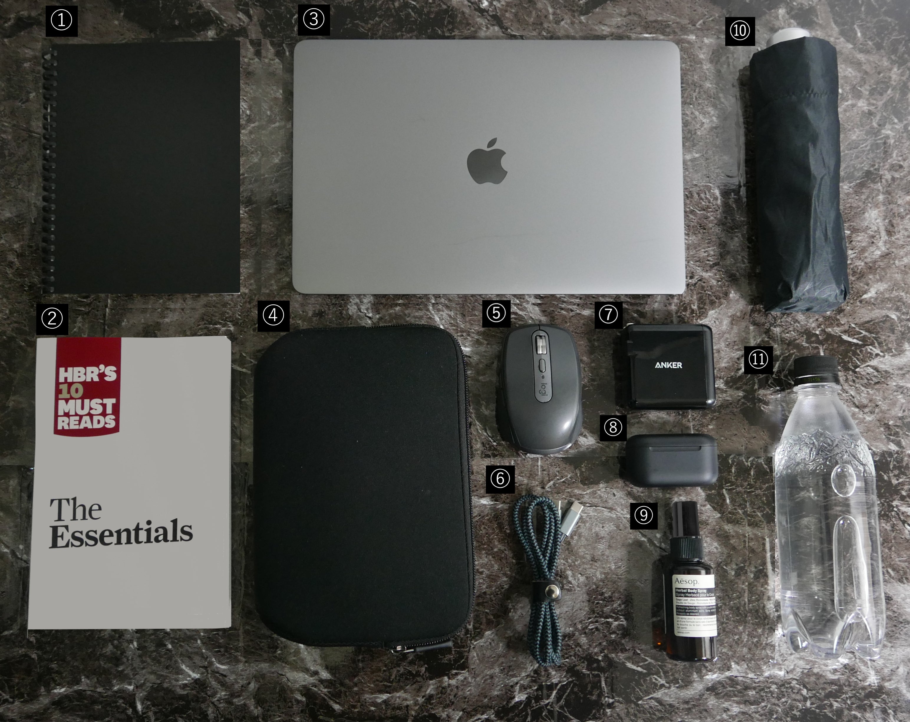 荷物の収納例:①ノート(中サイズ)※A4サイズ収納可 ②本(中サイズ) ③PC13インチ ④マルチポーチ ⑤マウス ⑥USBケーブル ⑦充電器 ⑧ワイヤレスイヤホン ⑨化粧品 ⑩折り畳み傘 ⑪ペットボトル