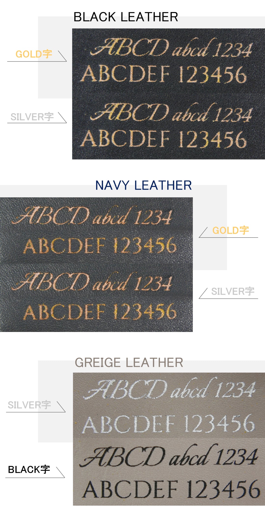 視認性の問題がありブラックレザー✕ブラック字、ネイビーレザー✕ブラック字、グレージュレザー✕ゴールド字は選択対象外となっています。