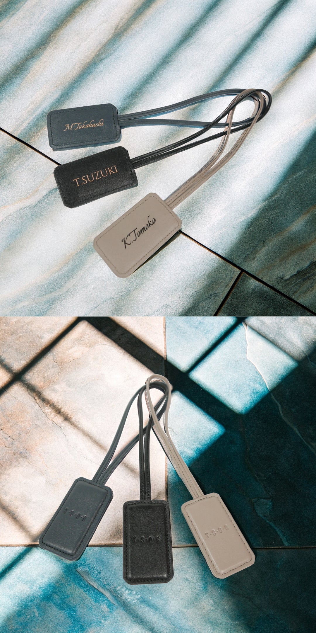バッグやスーツケースに付けられる、本革ネームタグ。