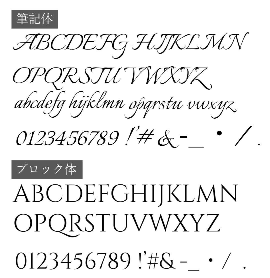 筆記体(大文字/小文字可)或いは、ブロック体(大文字のみ)のどちらかをご選択頂けます