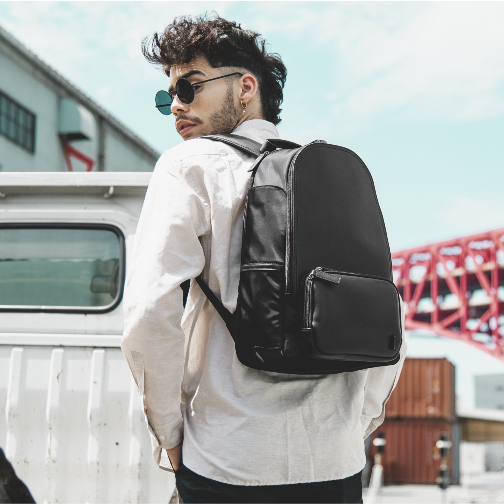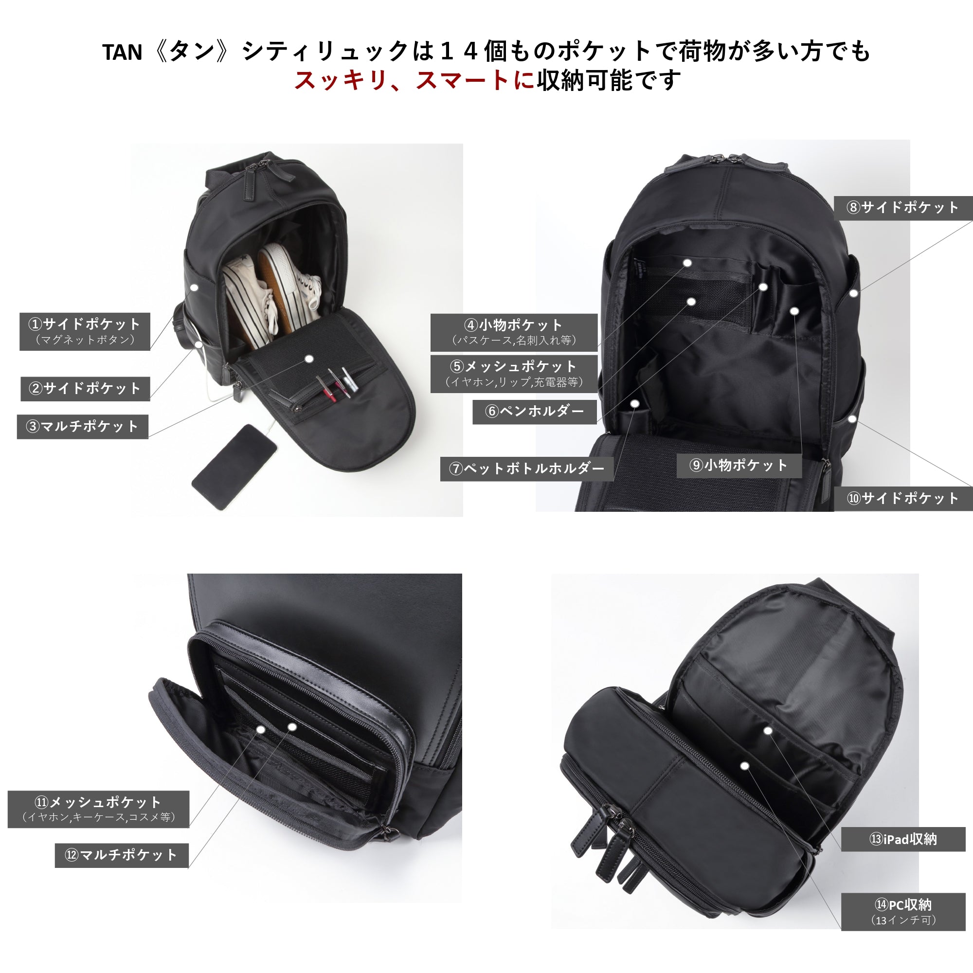 新作TAN《タン》の開発コンセプトとして、如何にシンプルさを追求しながらも機能性を持たせるかという点に注力しました。開口部は大きく開くことで、モノの出し入れのしやすさは勿論、ポケットも使いやすさを重視し、ノートパソコン、タブレット、小物、カードケース、イヤホン、スマホ、ペットボトル、アクセサリー等考えられ得る様々な収納をすることを前提とした設計となっています。